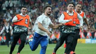 Real madrid atağında sahaya giren taraftar, güvenlik güçleri tarafından saha dışına çıkarıldı. Real madrid atağında sahaya giren taraftar, güvenlik güçleri tarafından saha dışına çıkarıldı. Dakikasında bir taraftar sahaya girince oyun durdu. Real madrid sahaya 12 kişi ile girdi. Içine ortasını yapıyor ancak bu topu kademeye giren savunma oyuncuları uzaklaştırıyor.
